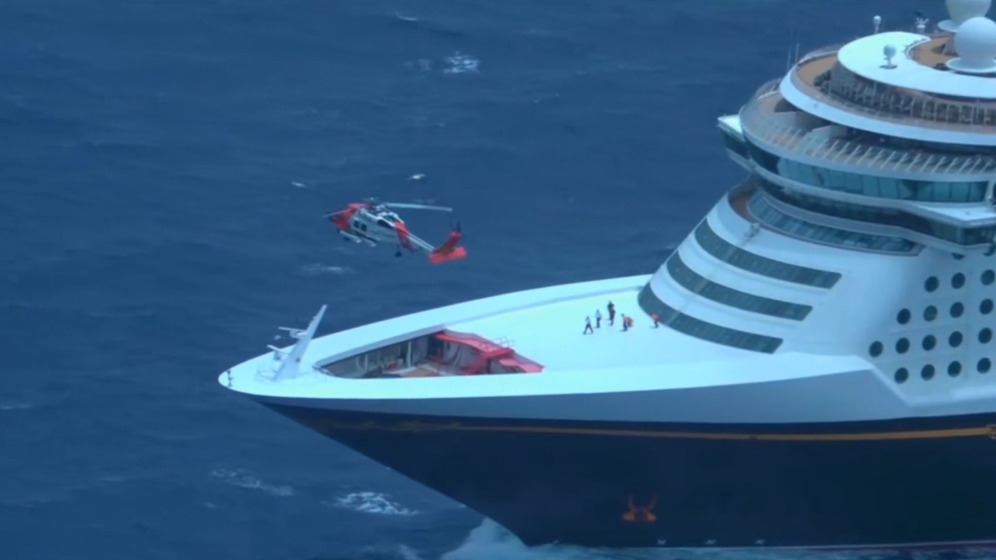 A MH-60T Jayhawk helicopter was filmed landing on the bow of the Disney Fantasy ship that was sailing 180 miles northwest of Aguadilla in Puerto Rico.